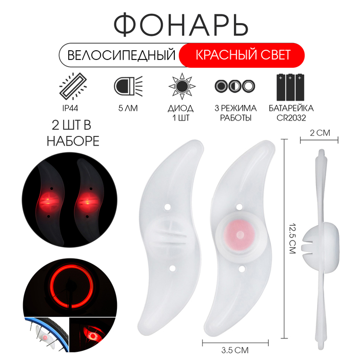 Фонарь велосипедный на спицу, водонепроницаемый, 1 диод, 12.5 х 3.5 х 2 см, 2 шт, красный