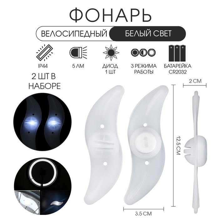Фонарь велосипедный на спицу, водонепроницаемый, 1 диод, 12.5 х 3.5 х 2 см, 2 шт, белый