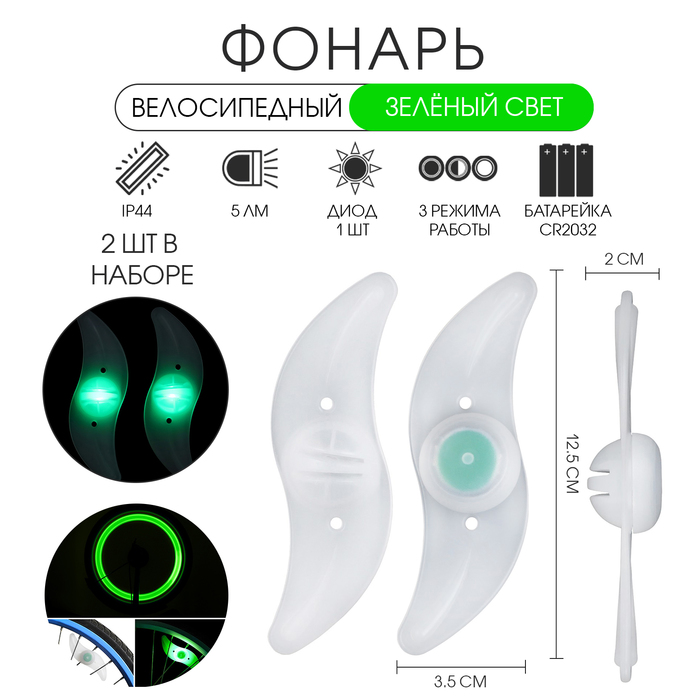 Фонарь велосипедный на спицу, водонепроницаемый, 1 диод, 12.5 х 3.5 х 2 см, 2 шт, зеленый