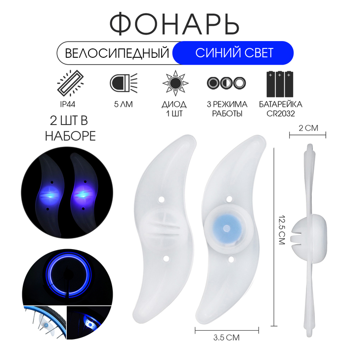 Фонарь велосипедный на спицу, водонепроницаемый, 1 диод, 12.5 х 3.5 х 2 см, 2 шт, синий