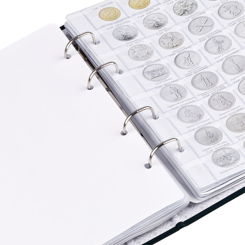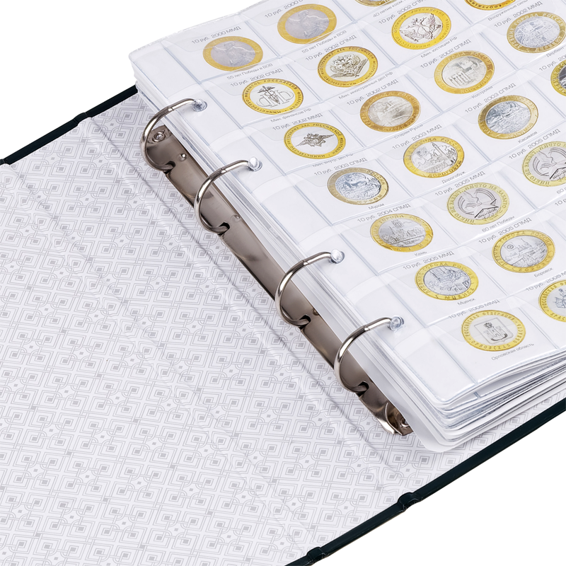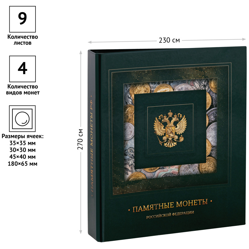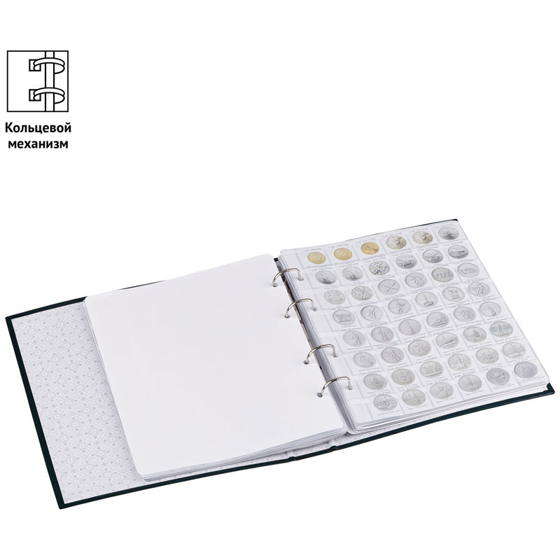 Альбом для монет на кольцах "Памятные монеты РФ", 13 листов, разделители с перечнем монет, ламинированный, 230*265*40мм. Наполение: 7 листов ячейки 35*34мм на 35 ячеек, 3 листа ячейки 28*28мм на 48 ячеек, 2 листа 5 ячеек 35*35мм, 3 ячейки для бон 180*60мм, 1 лист 4 ячейки 44*35мм, 3 ячейки для бон 180*60мм, 13 разделителей с макетом монет. Кольца D-образной формы гарантируют удобное пользование, а дизайнерское решение обложки позволит вашей коллекции быть самой уникальной!
