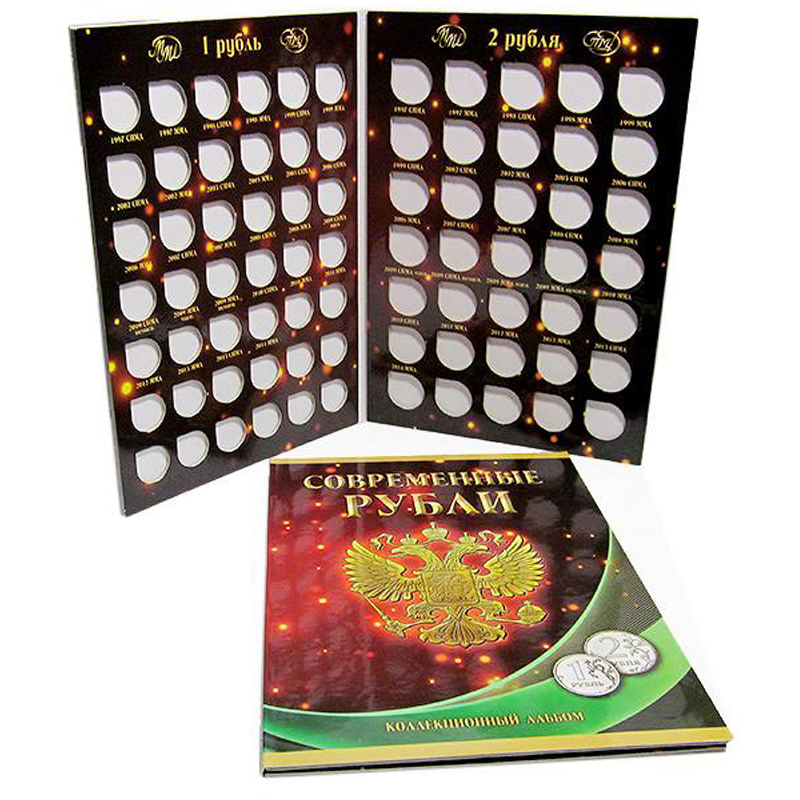 Альбом-планшет под современные 1 и 2 рубля, выпущенные Московским и Санкт-Петербургским монетными дворами с 1997 по 2019 гг. Материал: плотный ламинированный картон с вырубленными в нем каплевидными ячейками.