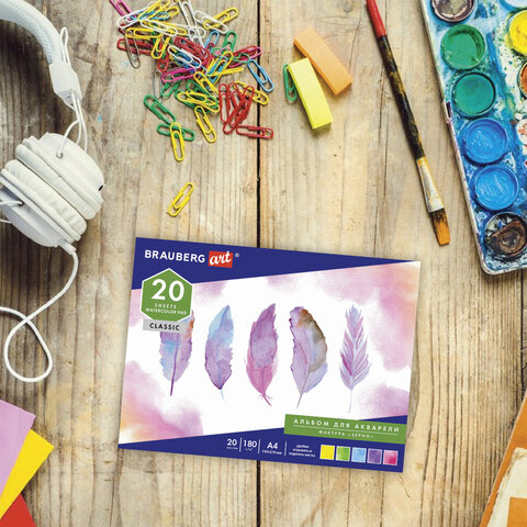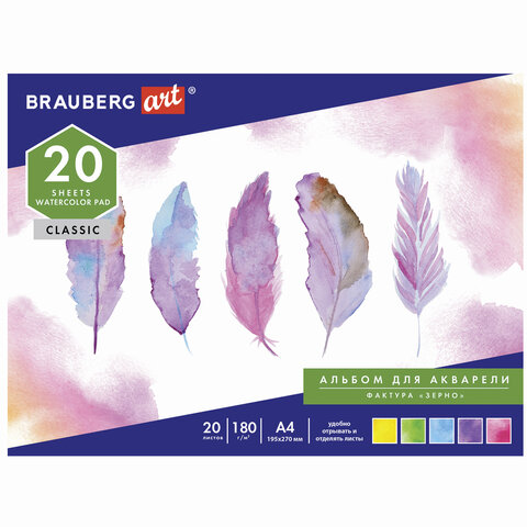 Альбом для акварели BRAUBERG содержит 20 листов формата А4 (195х270 мм), специально предназначенных для рисования всеми видами водорастворимых красок, а так же подходят для акварельных карандашей, гуаши, темперы, акрила, масляной и сухой пастели, угля, соусов, сепии, сангины и смешанных техник.. Качественные листы высокой плотности 180 г/м2 устойчивы к истиранию, воздействию влаги, обеспечивают чистую реалистичную передачу цвета. Белизна 100%. Текстура бумаги "зерно" подходит для разных техник рисования: как для детализированной живописи, так и для создания красивых зернистых эффектов. Обложка выполнена из мелованного картона.