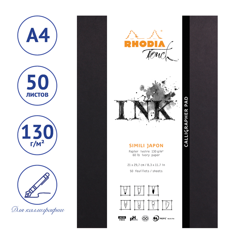 Бумага Clairefontaine Rhodia Touch SIMILI JAPAN разработана французской фирмой специально для каллиграфии из 100% целлюлозы. Плотность блока: 130 г/кв. м. Бумага подходит для любых каллиграфических техник. На ней можно работать ручкой, кистью, пером, карандашом, используя чернила, тушь, гуашь, акварель, маркеры. Бумага имеет кремовый оттенок, идеально ровная с обеих сторон, бескислотная.<br/>• Тип скрепления: скоба;<br/>• Количество листов: 50;<br/>• Плотность блока: 130 г/кв. м.