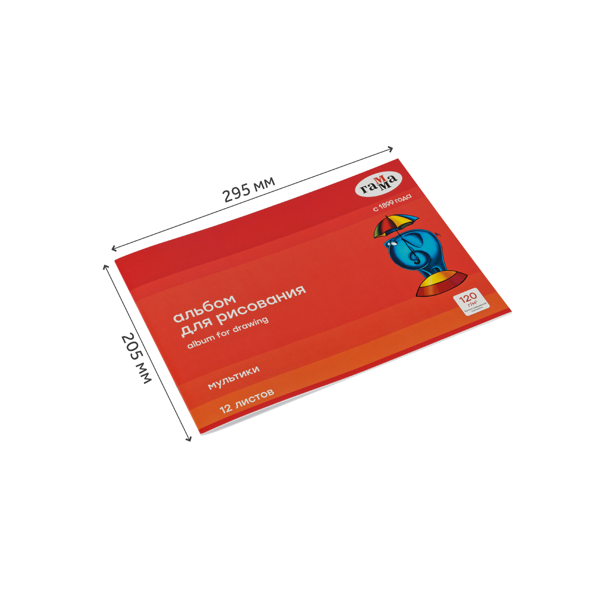 Альбом для рисования ГАММА «Мультики» формата А4 размером 205*295 мм с обложкой из мелованного картона состоит из 12 листов офсетной бумаги, тип скрепления — скрепка. Плотность бумаги — 120 г/кв.м. Альбом подходит для рисования акварелью, гуашью, акрилом, восковыми мелками, фломастерами, цветными и чёрно-графитными карандашами. Без возрастных ограничений.
