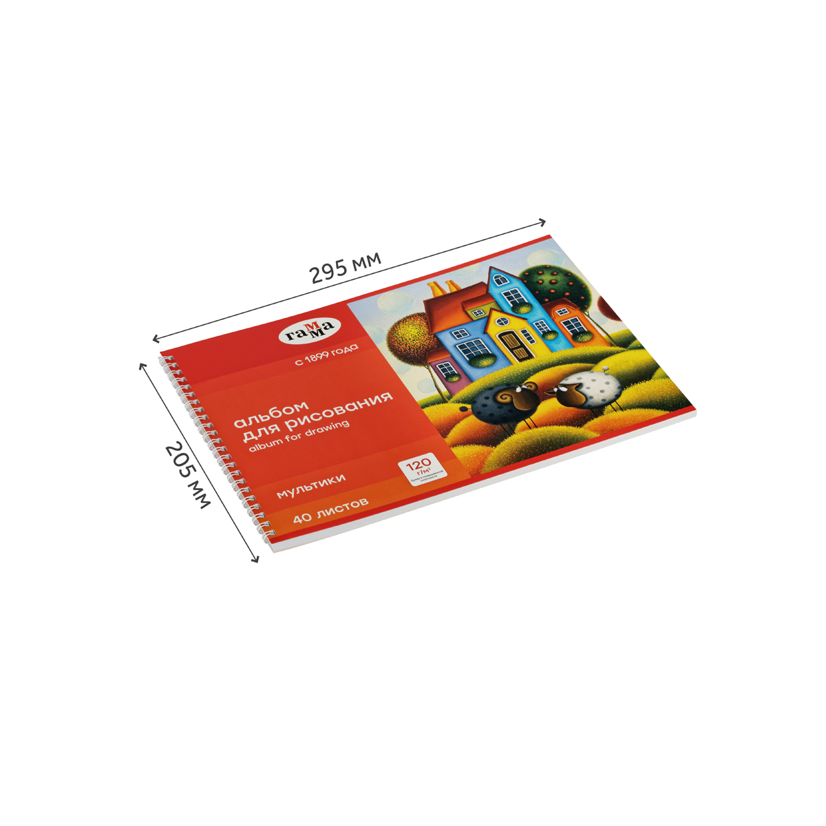 Альбом для рисования ГАММА «Мультики» формата А4 размером 205*295 мм с обложкой из мелованного картона состоит из 40 листов офсетной бумаги, тип скрепления — гребень. Плотность бумаги — 120 г/кв.м. Альбом подходит для рисования акварелью, гуашью, акрилом, восковыми мелками, фломастерами, цветными и чёрно-графитными карандашами. Без возрастных ограничений.