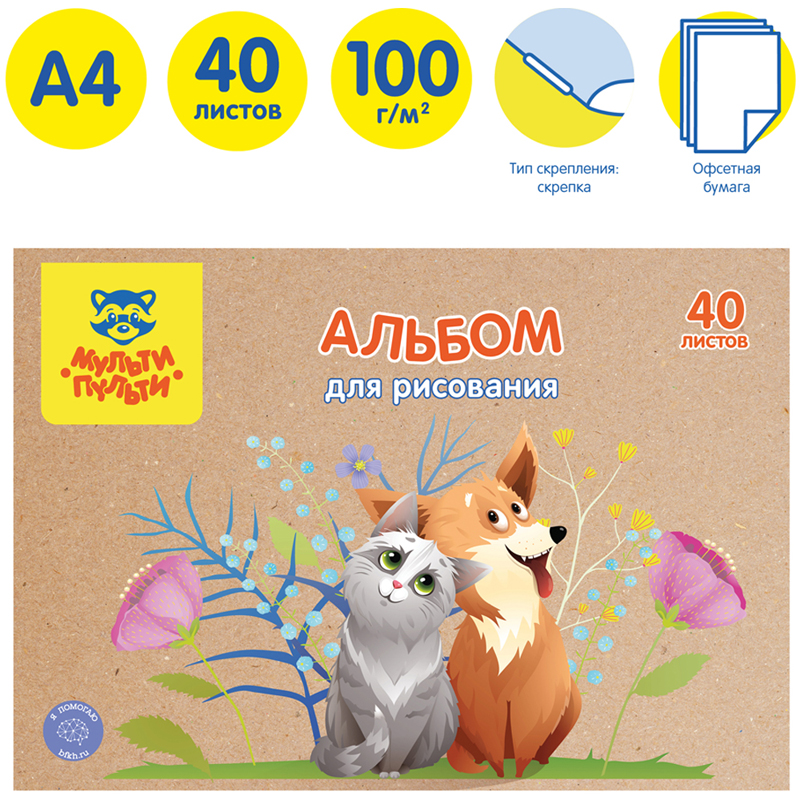 Альбом для рисования «Мульти-Пульти» состоит из 40 листов формата А4 и отлично подходит для рисования различными типами красок, фломастерами, цветными и чернографитными карандашами, гелевыми ручками. Плотность бумаги: 100 г/кв.м. Размер: 205*285 мм. Внутренний блок: офсетная бумага. Материал обложки: крафт картон. Благодаря этому альбом выглядит необычно, ярко и интересно.<br/>• Формат: А4;<br/>• Тип скрепления: скрепка;<br/>• Количество листов: 40.