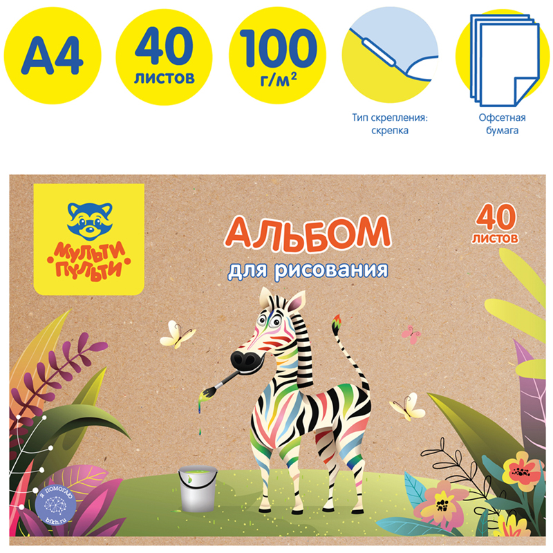 Альбом для рисования «Мульти-Пульти» состоит из 40 листов формата А4 и отлично подходит для рисования различными типами красок, фломастерами, цветными и чернографитными карандашами, гелевыми ручками. Плотность бумаги: 100 г/кв.м. Размер: 205*285 мм. Внутренний блок: офсетная бумага. Материал обложки: крафт картон. Благодаря этому альбом выглядит необычно, ярко и интересно.<br/>• Формат: А4;<br/>• Тип скрепления: скрепка;<br/>• Количество листов: 40.
