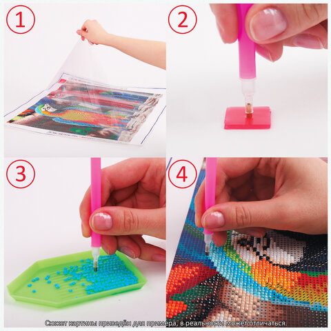 Техника алмазной мозаики проста в исполнении и не требует владения никакими специальными навыками. Все необходимые для работы материалы и инструменты входят в набор. С подробной инструкцией можно ознакомиться на упаковке.