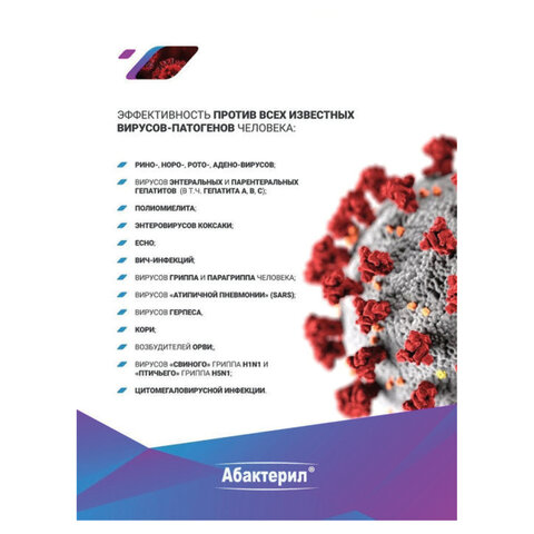 Дезинфицирующее средство «Абактерил-актив» обладает антимикробной активностью в отношении грамотрицательных и грамположительных бактерий (включая микобактерии туберкулеза – тестировано на Mycobacterium terrae, возбудителей внутрибольничных инфекций (ВБИ) – тестировано на Pseudomonas aeruginosa, кишечных инфекций- E. Coli, S. Aureus, S. Typhimurium, метициллин-резистентный стафилококк и ванкомицин-резистентный энтерококк); вирусов (в отношении всех известных вирусов-патогенов человека, в том числе рино-, норо-, рото-, адено-вирусов, вирусов энтеральных и парентеральных гепатитов ( в т.ч. гепатита А, В, С), полиомиелита, энтеровирусов Коксаки, ЕСНО, ВИЧ-инфекций, вирусов гриппа и парагриппа человека, вирусов «атипичной пневмонии» (SARS), вирусов герпеса, кори, возбудителей ОРВИ, вирусов «свиного» гриппа H1N1 и «птичьего» гриппа H5N1, цитомегаловирусной инфекции и.т.д.), фунгицидной активностью в отношении грибов рода Кандида и Трихофитон.