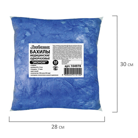 Бахилы – стандартный атрибут любого медицинского и фармацевтического учреждения, косметологических кабинетов, пищевых предприятий, особо чистых производств, лабораторий и других помещений. Среди многообразия современных моделей наибольшей популярностью пользуются тонкие бахилы. Они, как и особо прочные бахилы, плотно сидят на обуви и препятствуют распространению уличной пыли в заведениях. Бахилы класса «Эконом» производятся из гладкой полиэтиленовой пленки низкого давления. Эти бахилы обладают хорошими показателями плотности (17 мкм) и весом 1,8 г, надежностью и низкой стоимостью. Бахилы из полиэтилена изготавливаются в синем цвете и универсальном размере 40х14 см. Поставляются в комплекте по 100 штук (50 пар).