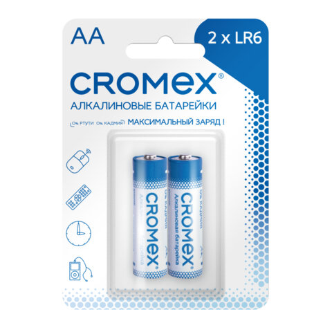 Щелочные (алкалиновые) батарейки CROMEX популярного типоразмера АA идеально подходят для приборов со средним потреблением энергии. Рекомендуется использовать в фотоаппаратах, компьютерных мышах, пультах ДУ, часах.