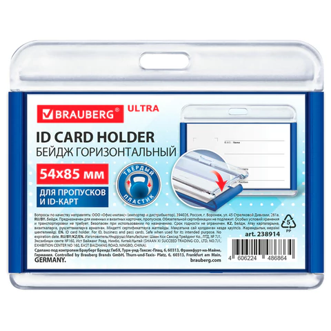 Бейдж горизонтальный для пропуска и ID-карт 54х85 мм синий, BRAUBERG ULTRA, 238914