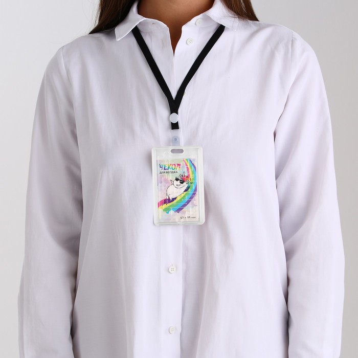 Бейдж-карман вертикальный пластиковый, внешний 110x68мм, внутренний 85x54мм, лента 80x2см, чёрный.