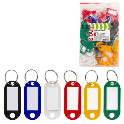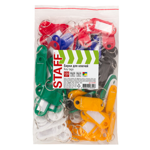 Бирки для ключей КОМПЛЕКТ 100 шт., длина 52 мм, инфо-окно 32х15 мм, цвет ассорти, STAFF, 237730