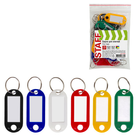 Бирки для ключей КОМПЛЕКТ 100 шт., длина 52 мм, инфо-окно 32х15 мм, цвет ассорти, STAFF, 237730