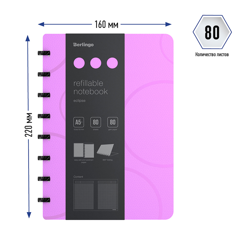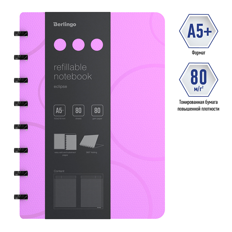 Бизнес-тетрадь Berlingo "Eclipse" - это практичное, стильное и современное изделие для планирования и записей. Такая бизнес-тетрадь является незаменимым инструментом для деловых людей. Увеличенная толщина обложки (1500мкм). Формат А5+. Нежный фиолетовый цвет внешней стороны в сочетании с изящной фактурой в виде глянцевых пересекающихся окружностей. Контрастный яркий голубой цвет внутренней поверхности. Материал обложки - трехслойный пластик (полифом), надежно защищает внутренний блок от влаги, замятия и загрязнения, обложка устойчива к загрязнениям. Вид скрепления – стильные имиджевые черные кольца, с возможностью раскрывать тетрадь на 360⁰. Возможна замена бумажного блока и быстрая и удобная выемка/вставка листов без повреждений. Бизнес-тетрадь содержит съемную брендированную линейку, которую можно использовать как закладку или разделитель и с легкостью можно перемещать в удобное место. Внутренний блок – высококачественная тонированная бумага, плотностью 80г/м2, 80 листов в клетку, рамка для заголовка, темы или даты, поля с обеих сторон блока на каждом листе, линовка на вылет. Размер бизнес-тетради 220*160мм, диаметр колец 22мм. Упаковка в термоусадочную пленку позволяет предохранить листы от замятия и загрязнения в процессе транспортировки.