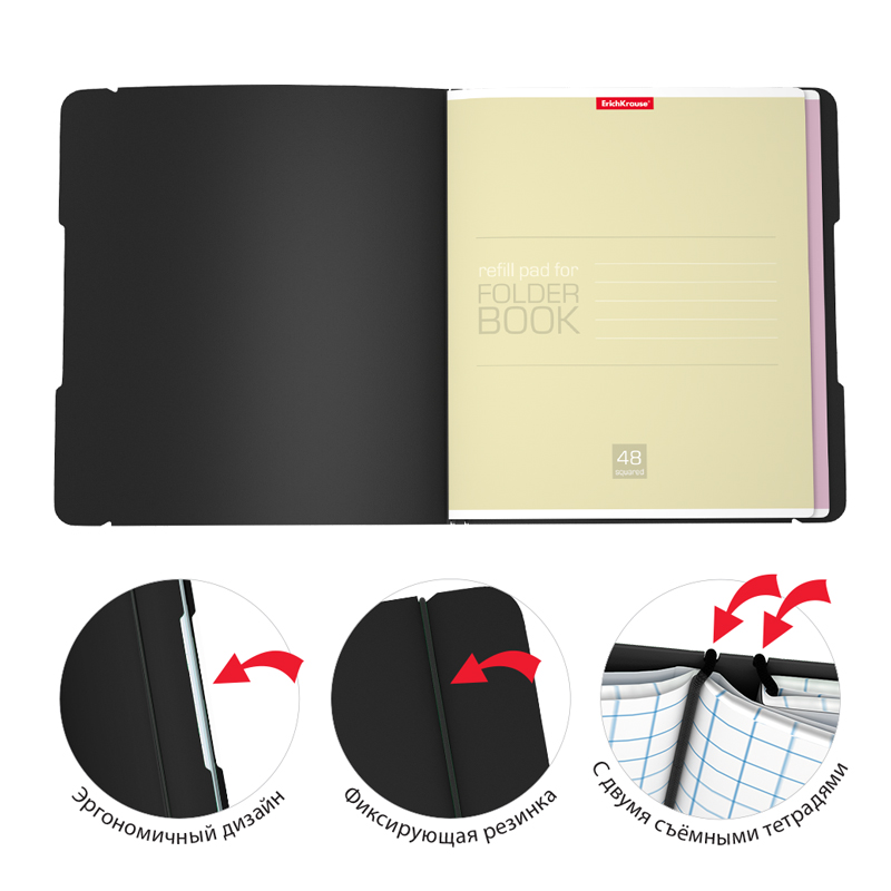 Тетрадь общая ученическая формата А5+ (170*203 мм) со сменными блоками FB Solution в пластиковой обложке. В комплект входят две тетради 48 листов на скобе в клетку с полями. Удобная система крепления на резинках дает возможность быстрой замены тетрадей, а фиксирующая резинка предотвращает нежелательное раскрытие. Эргономичный дизайн: специальные выемки на обложке облегчают перелистывание. Обложка из высококачественного износостойкого матового пластика с фактурой «песок». Бумага офсетная плотностью 60 г/м2. Цвет линовки — синий. Скругленные уголки обложки и блока. Рекламный вкладыш с информацией о товаре. Тетради упакованы в пакет по 2 штуки