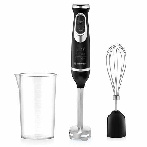 Модель BRAYER BR1241 поставляется с удобным мерным стаканом объемом 700 мл, венчиком для взбивания и насадкой-блендером.