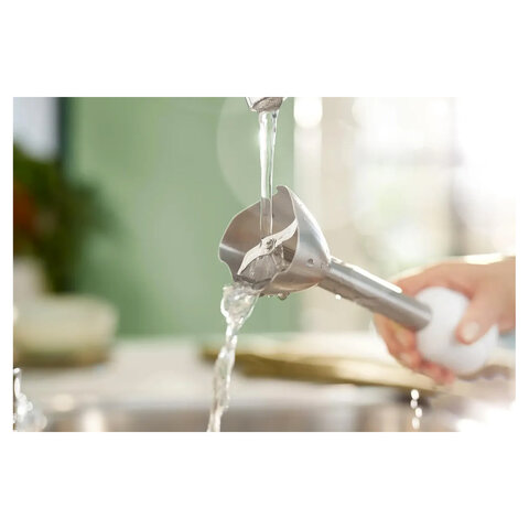 Насадка, предотвращающая разбрызгивание. Особая волнообразная форма нижней части погружной насадки блендера защищает от разбрызгивания во время приготовления блюд, оставляя рабочую поверхность чистой.