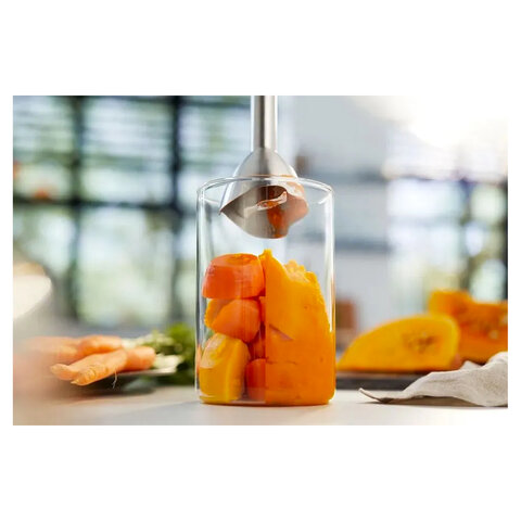 Насадка, предотвращающая разбрызгивание. Особая волнообразная форма нижней части погружной насадки блендера защищает от разбрызгивания во время приготовления блюд, оставляя рабочую поверхность чистой.
