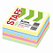 Стикеры 5 пастельных цветов (желтый, голубой, розовый, зелёный, белый) и 3 неоновых (синий, оранжевый, желтый) в форме куба 51х51 мм состоят из 250 листов. Плотность бумаги составляет 75 г/м2. Клейкий слой - 22 Н/м. Легко клеятся к любой поверхности. Не оставляют следов. Упакованы в полиэтиленовую пленку.