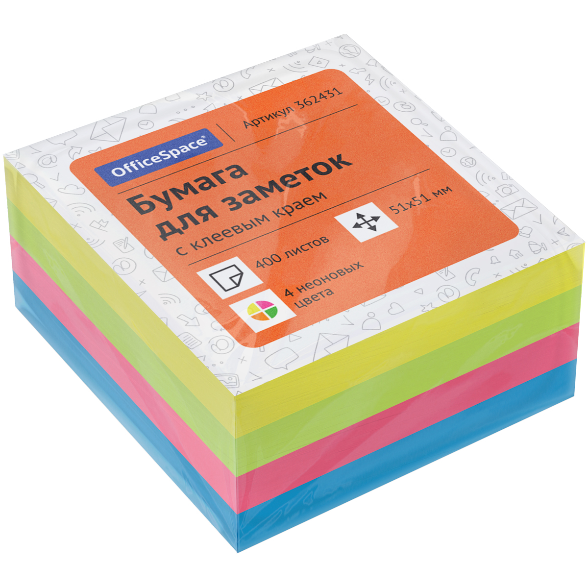Блок бумаги для записей с клеевым краем OfficeSpace подойдёт для оперативного сохранения важной информации. Плотность бумаги для заметок составляет 75 г/м2. Размер листа в блоке для заметок 51*51 мм. В блоке 400 листов четырех неоновых цветов. Блок квадратной формы имеет клеевой край, позволяющий прикреплять стикер к любой поверхности.<br/>• Количество листов: 400;<br/>• Цвет блока: цветной;<br/>• Склейка: есть