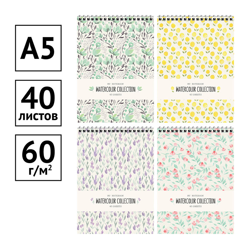 ВНИМАНИЕ: БОЛЬШИНСТВО ЭЛЕМЕНТОВ В НАБОРЕ МОГУТ ИМЕТЬ ОДИНАКОВЫЙ ДИЗАЙН.<br/>Блокнот на гребне ArtSpace «Узоры. Watercolor collection» формата А5 (145*205мм) состоит из 40 листов прекрасно подойдет для работы и учебы. Внутренний блок – это офсетная бумага плотностью 60 г/м², линовка – клетка, тип скрепления – гребень/спираль. Обложка блокнота ArtSpace из мелованного картона. Обложка придется по вкусу любителям цветов.<br/>• Формат: А5;<br/>• Кол-во листов: 40;<br/>• Линовка: клетка;<br/>• Материал обложки: мелованный картон.