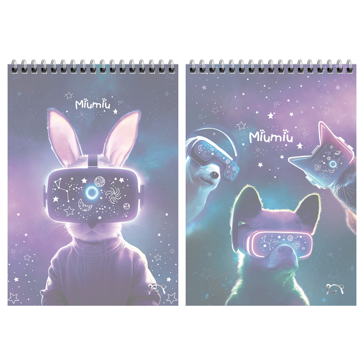 Блокнот Meshu Miumiu формата А5 прекрасно подойдёт для работы и учёбы.<br/>Состоит из 60 листов размером 142*202 мм дизайнерской офсетной бумаги белого цвета плотностью 60г/м2. Линовка – клетка. Обложка – прозрачный пластик с тиснением фольгой, дополнительный лист повышенной плостности с яркой иллюстрацией. Космические питомцы привлекут ваше внимание.<br/>• формат: А5 (142*202 мм);<br/>• кол-во листов: 60;<br/>• линовка: клетка;<br/>• вид скрепления: гребень/спираль;<br/>• материал обложки: пластик.