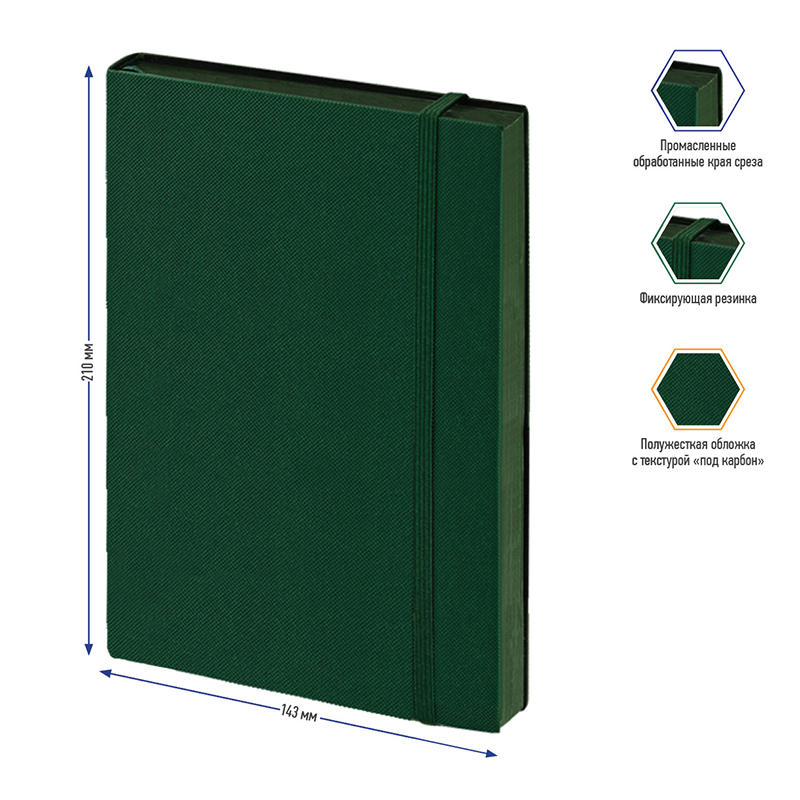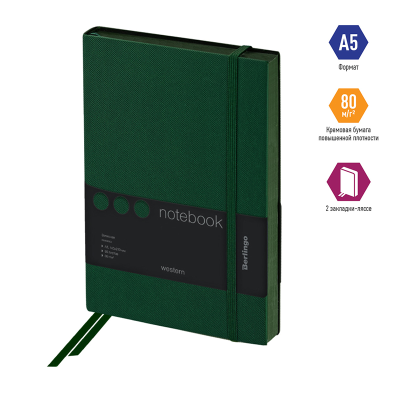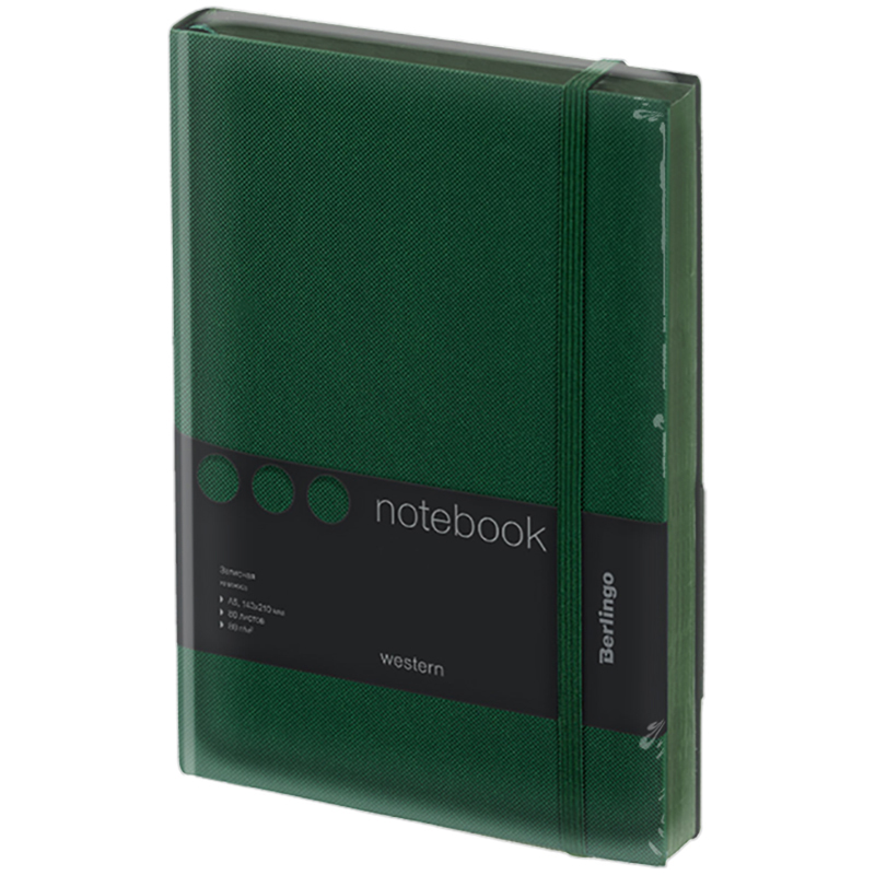 Записная книжка Berlingo Western формата А5 с полужесткой обложкой и стильным тиснением под карбон – идеальный подарок для деловых людей. Обложка и срез выполнены в зелёном цвете. Прошитый внутренний блок из 80 листов кремовой бумаги повышенной плотности 80 г/м² имеет перфорированные уголки и линовку в клетку. Записная книжка Berlingo Western подходит под персонализацию, внутри 2 удобные закладки-ляссе. В подарок – 3 комплекта стикеров с латинским, русским алфавитом и пиктограммами. Записная книжка представлена в размере 143*210 мм.