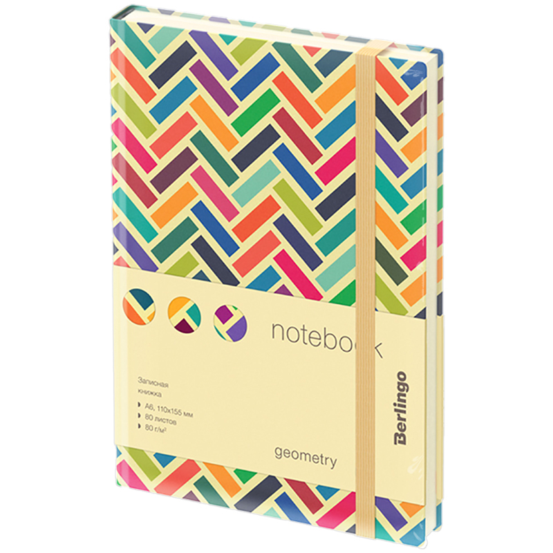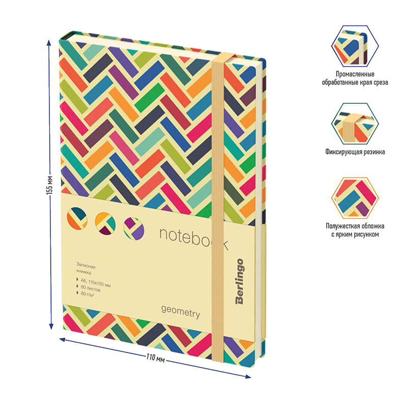 Компактная записная книжка Berlingo Geometry формата А6 с полужесткой обложкой и вертикальной фиксирующей резинкой идеально подойдет для срочных записей и ежедневного использования. Ассорти цветных элементов придает обложке яркий акцент. Прошитый внутренний блок из 80 листов кремовой бумаги повышенной плотности 80 г/м² имеет перфорированные уголки и линовку в клетку. Записная книжка Berlingo Geometry подходит под персонализацию и имеет 2 удобные закладки-ляссе. В подарок – 3 комплекта стикеров с латинским, русским алфавитом и пиктограммами. Записная книжка представлена в размере 110*155 мм.