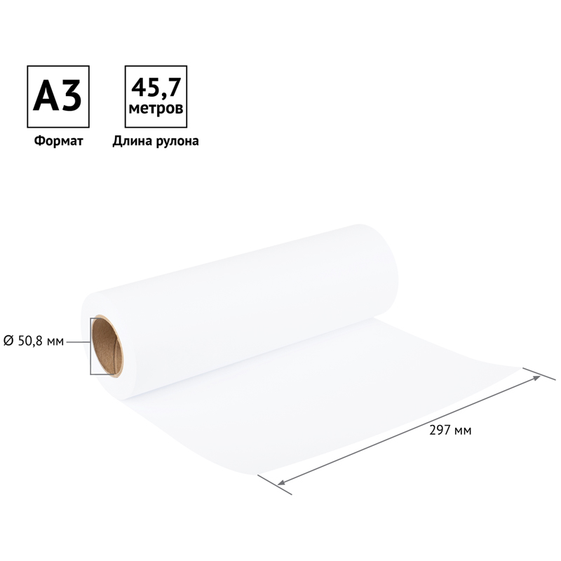 Размер бумажного полотна составляет 297 мм (11,7 in), что соответствует формату А3. Длина рулона - 45,7 м (150 ft). Внутренний диаметр втулки - 50,8 мм.