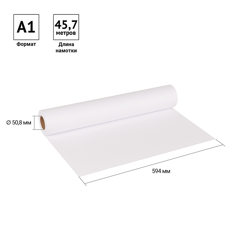 Размер бумажного полотна составляет 594 мм (23,4 in), что соответствует формату А1. Длина рулона - 45,7 м (150 ft). Внутренний диаметр втулки - 50,8 мм.