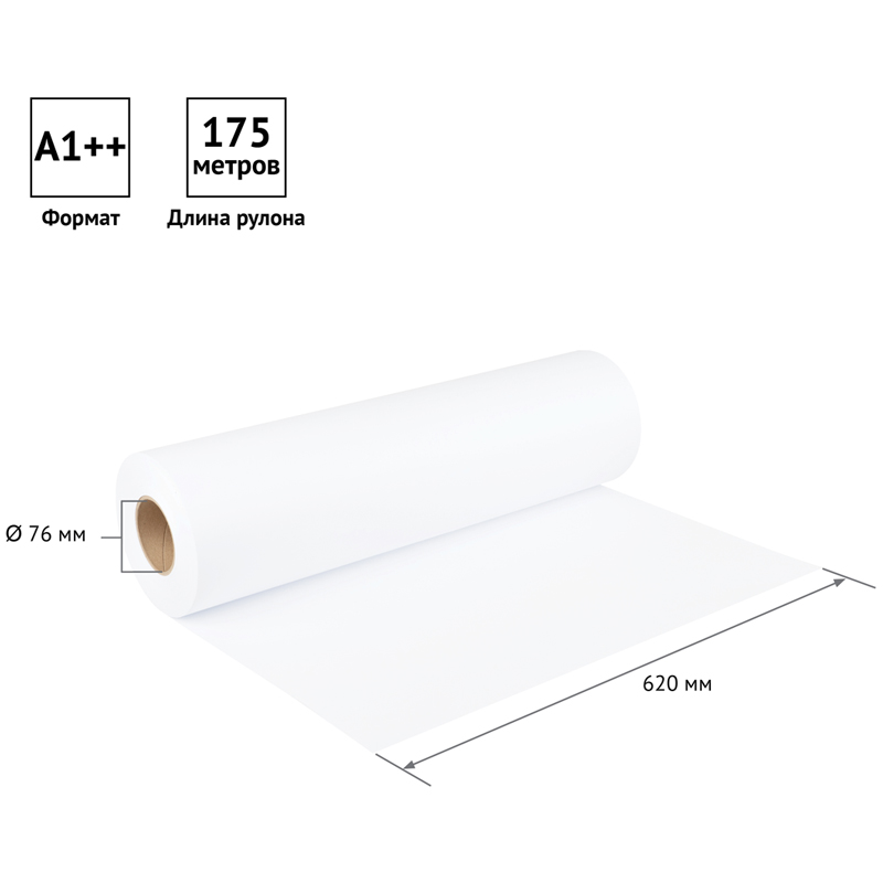 Размер бумажного полотна составляет 620 мм, что соответствует формату А1++. Длина рулона - 175 м. Внутренний диаметр втулки - 76 мм.