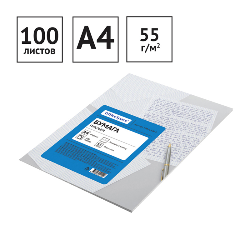 Бумага писчая OfficeSpace формата А4 – это отличный вариант для письма, секретарских работ, печати документации и изготовления печатной продукции на ризографах, матричных принтерах, малых печатных машинах и т.д. <br/>Бумага белого цвета имеет линовку в клетку. Плотность – 55 гр/м2, белизна – 100 % по ГОСТ. В упаковке писчей бумаги OfficeSpace 100 листов. В коробке 15 пачек.