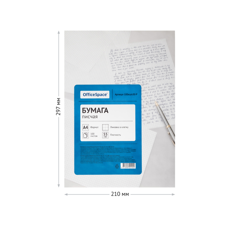 Бумага белого цвета имеет линовку в клетку. Плотность – 55 гр/м2, белизна – 100 % по ГОСТ. В упаковке писчей бумаги OfficeSpace 100 листов. В коробке 15 пачек.