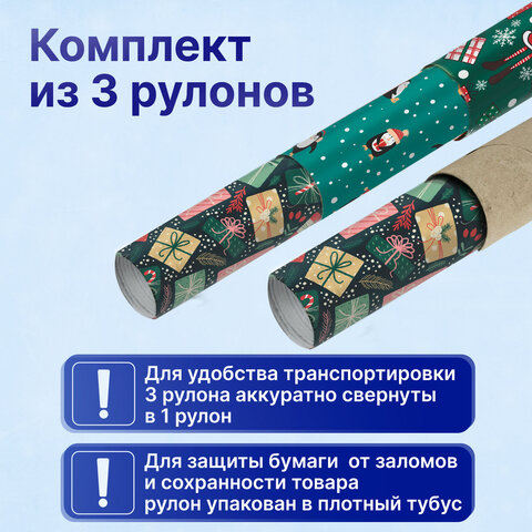В нашем наборе вы найдёте 3 рулона мелованной бумаги размером 70х100 см, каждый из которых выполнен в красивом новогоднем дизайне с ярким эффектом. Итоговая плотность бумаги – 105 г/м2.
