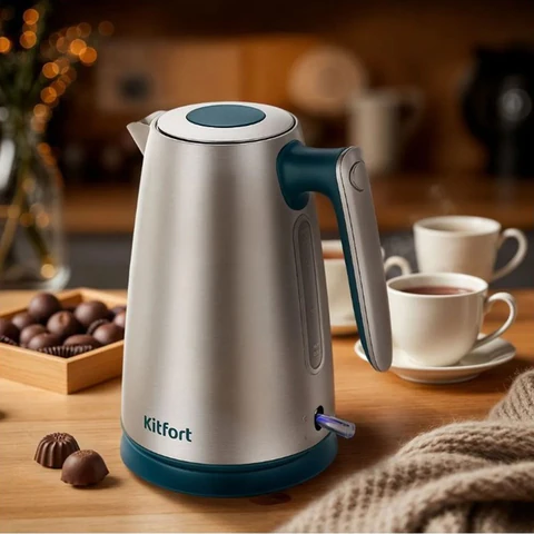 Чайник KITFORT КТ-8725 — это идеальное сочетание элегантности и функциональности. Его строгий металлический корпус в серебристо-бирюзовой гамме станет стильным акцентом на вашей кухне.