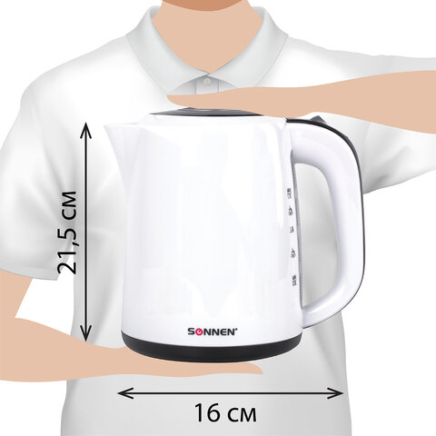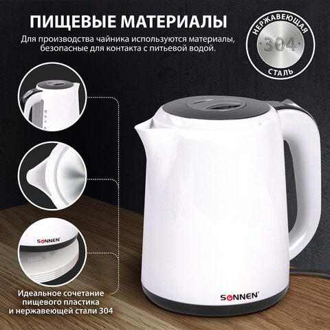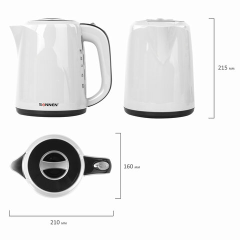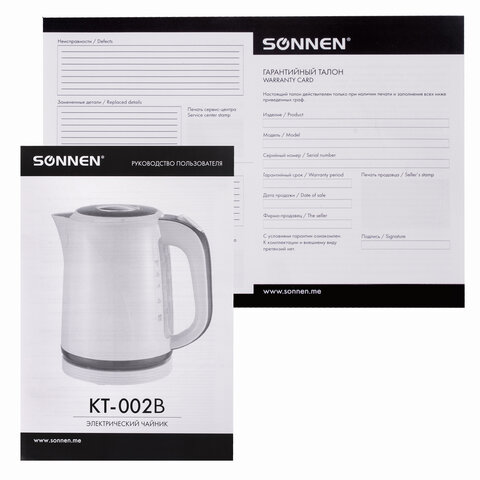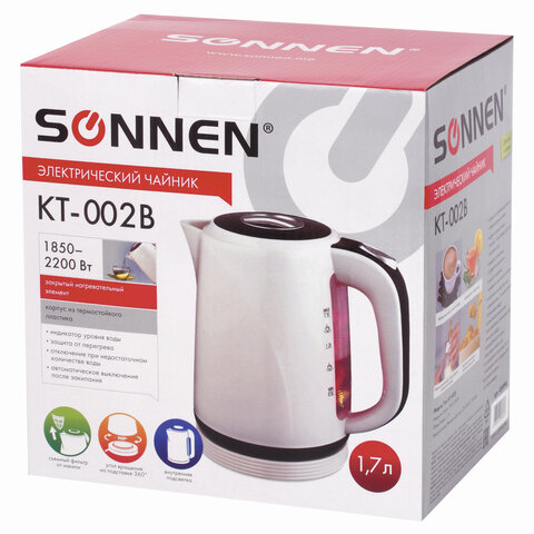 SONNEN KT-002В оснащается индикатором уровня воды в боковой части. С помощью него легко определить текущее количество жидкости. Вместе с этой моделью поставляется подставка круглой формы. Чайник можно установить в любом положении на 360 градусов. Очень удобно при повседневном использовании.
