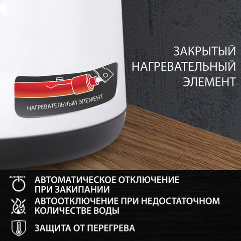 Подключается чайник к сети при помощи шнура с длиной 0.7 м. Есть подсветка, она эффектно дополняет дизайн. Осуществляется автоматическое отключение при снятии с подставки и закипании. Реализована защита от перегрева для обеспечения безопасности.
