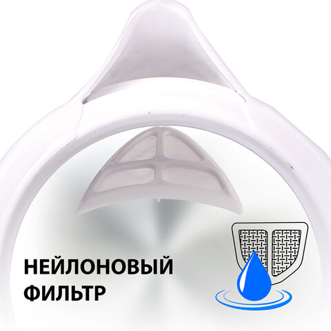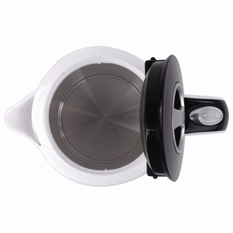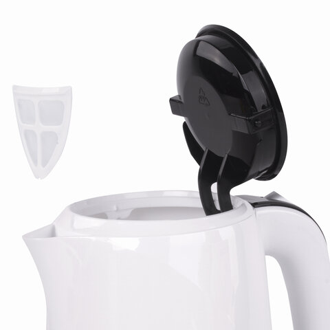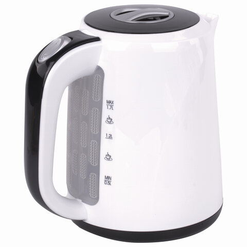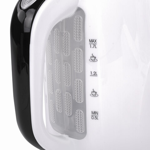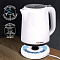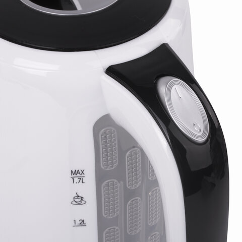 Объем чайника – 1,7 литра. Он изготовлен из качественного пластика, который выдерживает все внешние воздействия. Дизайн яркий и запоминающийся, подчеркнет ваш вкус и отлично впишется в любой интерьер. Цвет корпуса – белый.