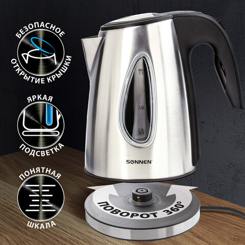 Чайник SONNEN KT-1721 отлично подойдет для эксплуатации как дома, так и в офисе. Прочный серебристый корпус из нержавеющей стали с черными вставками прекрасно впишется в любой интерьер.