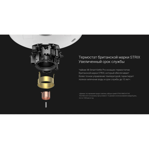 Чайник оснащен термостатом британской марки STRIX, который обеспечивает более точное управление температурой, гарантирует полное кипячение воды и долгий срок службы.