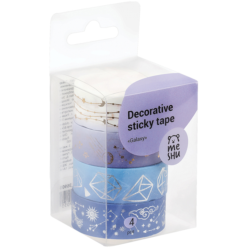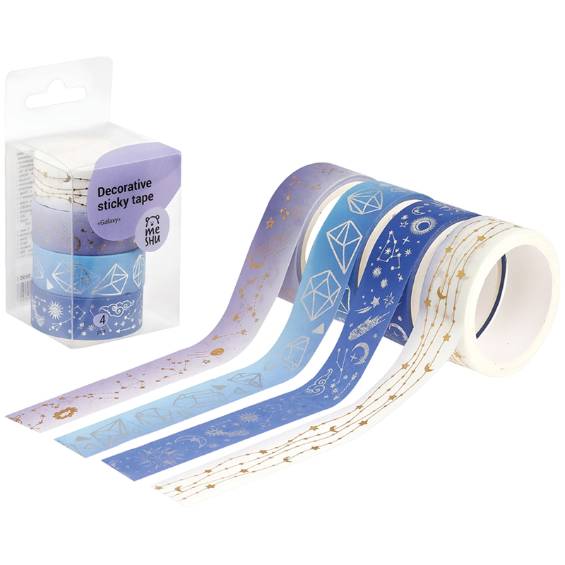 Декоративные клейкие ленты MESHU предназначены для упаковки подарков, оформления поделок, элементов интерьера и скрапбукинга. Открытки, альбомы, ежедневники, подставки, цветочные горшки, подсвечники, рамки и много другое может преобразиться с декоративными лентами MESHU. Яркие и современные дизайны сделают процесс творчества увлекательным, а результат впечатляющим. А качественная клеевая основа позволит надёжно зафиксировать ленту и быть уверенным в долговечности декора.<br/>• Ширина ленты: 15 мм; <br/>• Длина намотки: 3000 мм; <br/>• Материал: бумага;<br/>• Количество в наборе: 4.