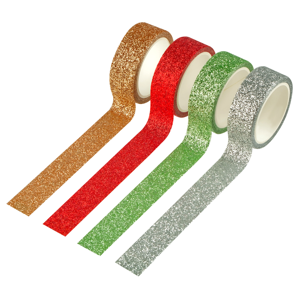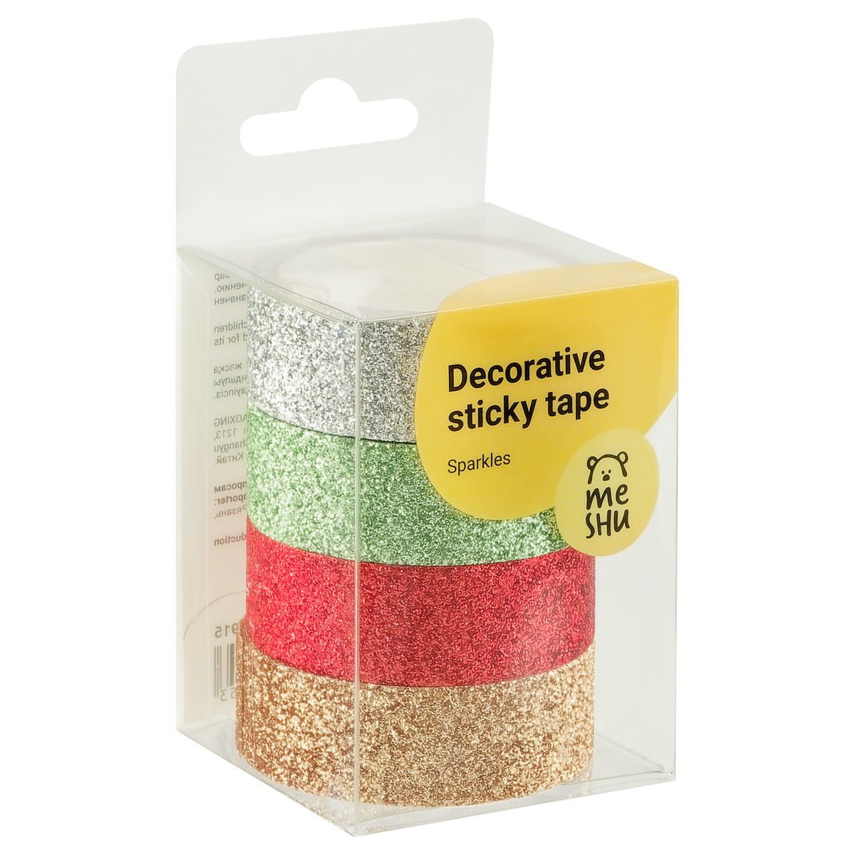 Декоративные клейкие ленты MESHU "Sparkles" предназначены для упаковки подарков, оформления поделок и скрапбукинга. В набор входят 4 изделия в едином стиле. Длина намотки – 3 000 м. Открытки, альбомы, ежедневники, подставки, цветочные горшки, рамки и многое другое может преобразиться с бумажными мерцающими лентами MESHU. Качественная клеевая основа позволит надёжно зафиксировать декор.<br/>• Ширина ленты: 15 мм;<br/>• Длина намотки: 3 000 мм;<br/>• Материал: бумага;<br/>• Количество в наборе: 4.