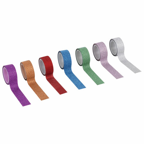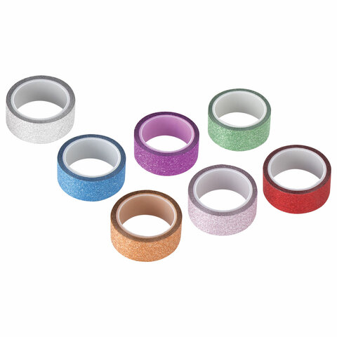 В наборе содержится 7 декоративных полимерных лент различных цветов с блестками, каждая из которых намотана на пластиковую втулку. Ширина ленты 15 мм позволяет наклеить её даже на небольшие поделки, а длина 3 м даёт большой простор для творчества.