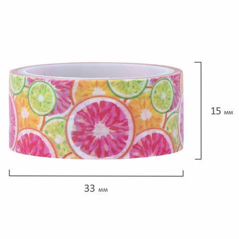 В наборе содержится 7 бумажных лент с яркими и сочными дизайнами на полупрозрачной клеевой основе, каждая из которых намотана на пластиковую втулку. Ширина ленты 15 мм позволяет наклеить её даже на небольшие поделки, а длина 3 м даёт большой простор для творчества.
