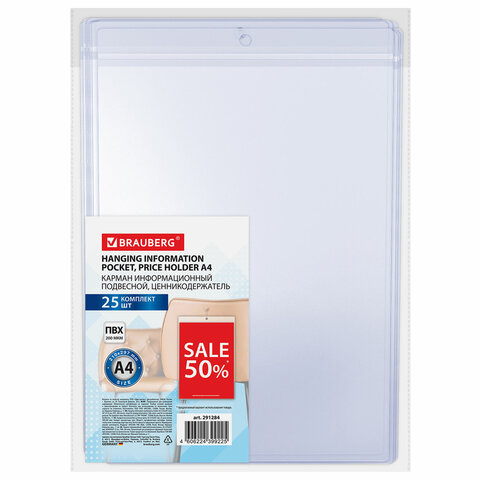 Карман имеет круглое отверстие для подвешивания ценника при помощи нейлоновых хомутов или веревочных биркодержателей. Предусматривает двустороннее размещение с верхней стороны. Формат: А4. Материал изготовления: мягкий ПВХ. Размер одного кармана - 21,7х30,5х0,1 см. Единица продажи - 25 шт., упакованы в пакет с липким краем.