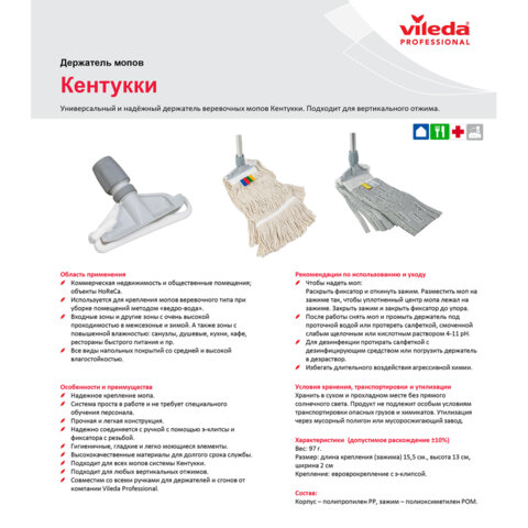 Система "Кентукки" - самая популярная и простая система для уборки полов. Хорошо подходит для участков с высокой проходимостью и уборки большого количества жидкой грязи. Традиционный держатель с надежным креплением, выдерживает сильный нажим на швабру.