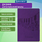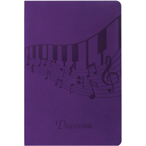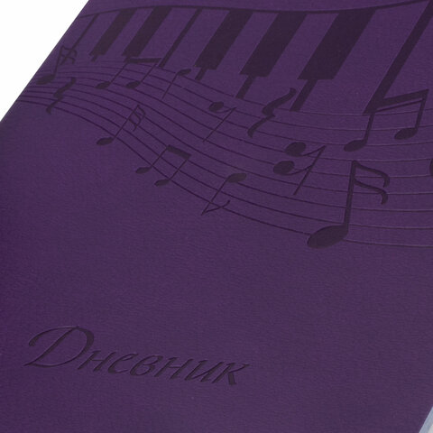 Внутренний блок изготовлен из белой офсетной бумаги повышенной плотности 70 г/м2. Содержит 48 листов для ведения записей и справочной информацией - длительности нот, интервалы, знаки в тональностях, ключи и пр. Обложка выполнена в фиолетовом цвете из экокожи - презентабельного и износоустойчивого материала. Элементы дизайна выполнены с помощью термотиснения. Для удобства использования дневник снабжен закладкой-ляссе.